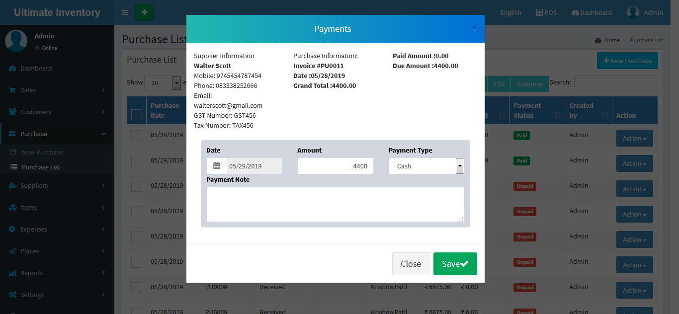 Purchase -> Purchase List -> Click on Action Button -> Click on View Payments